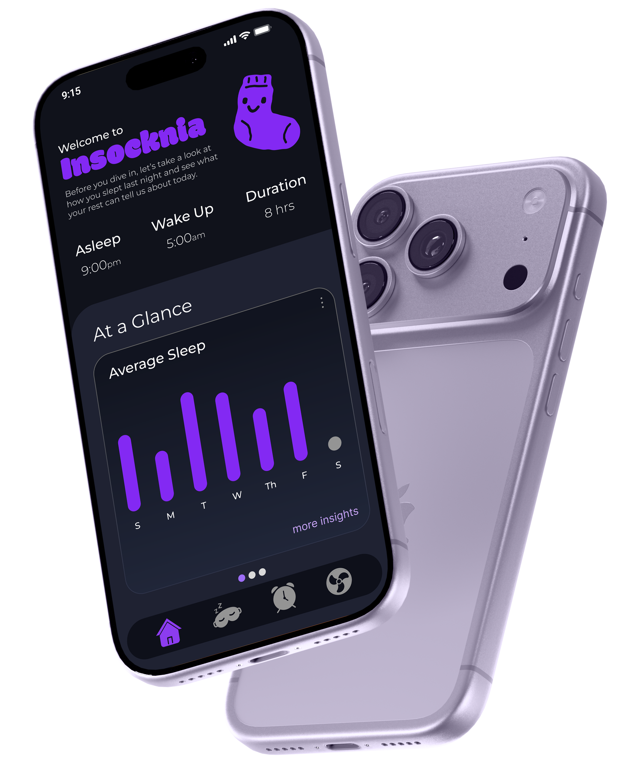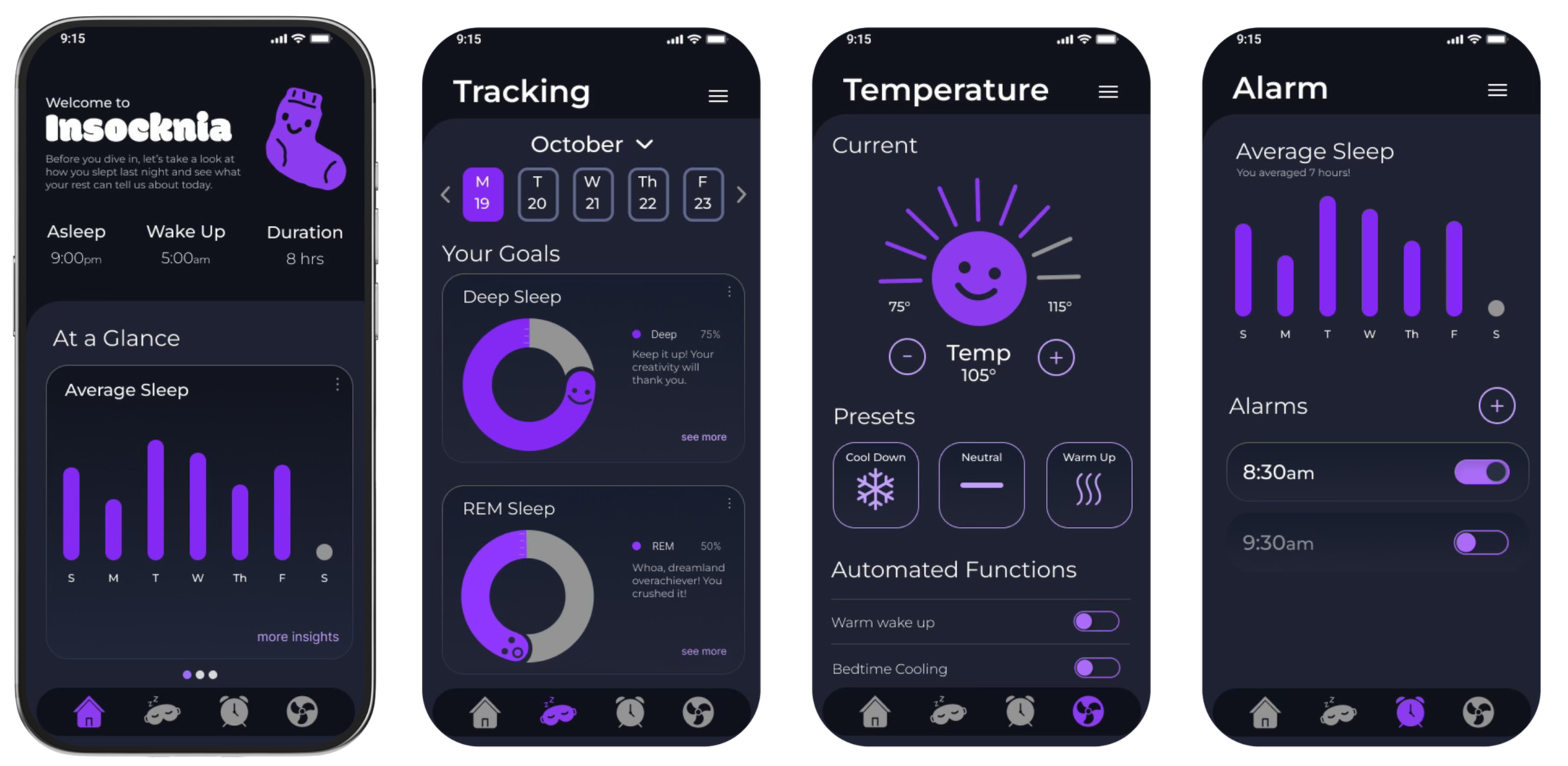 Insocknia is cozy tech for your feet with a focus on creating wonderful nights of sleep every time. This companion app is meant to work alongside a sock product that tracks different aspects of sleep. Through this, our users could control these aspects to curate their perfect night of sleep by utilizing a tracking system, a customizable alarm function and temperature control.